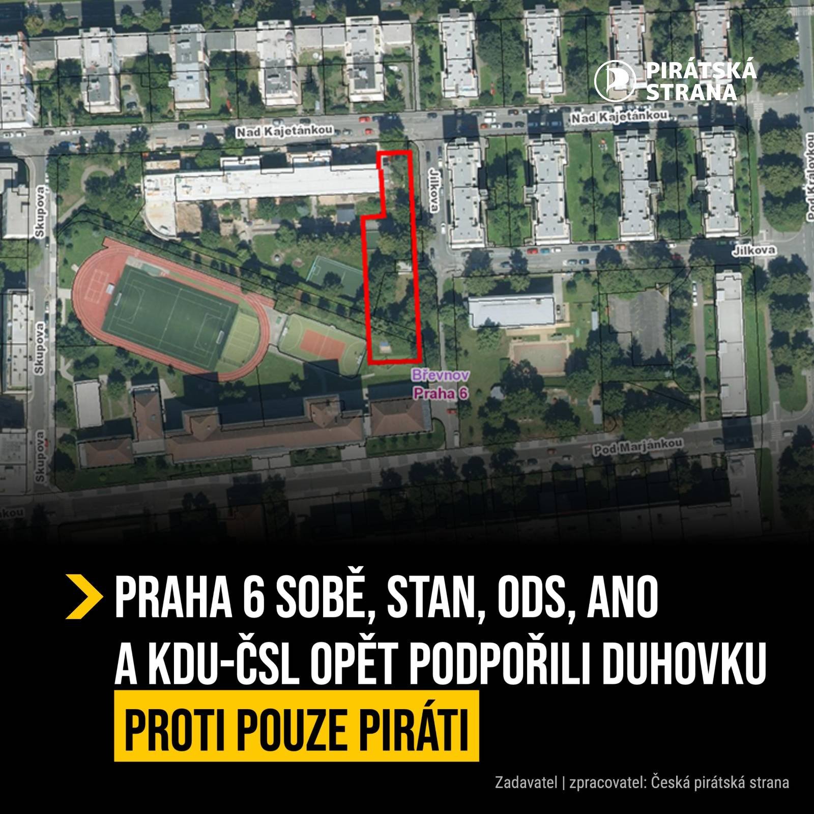 Projekt nového gymnázia Duhovka na Břevnově pokračuje bez ohledu na kohokoli a cokoli. Starosta Stárek (ODS) sice občanům slíbil diskusi, ale sliby voličům pro něj zjevně příliš neznamenají a těžkou hlavu si s nimi nedělá. Zatímco veřejná diskuse a participace s občany nad novou výstavbou ještě neproběhla a kdoví kdy a zda vůbec proběhne, jednání s investorem běží vesele dál. Projekt je zjevně tak urgentní, že bylo svoláno mimořádné jednání majetkové komise, kde zástupci Praha 6 Sobě, STAN, ODS, ANO a KDU-ČSL schválili dokumenty o výstavbě soukromého gymnázia mezi ulicemi Pod Marjánkou a Nad Kajetánkou. Proti hlasoval pouze jediný člen komise - pirátský zastupitel Martin Suchan.