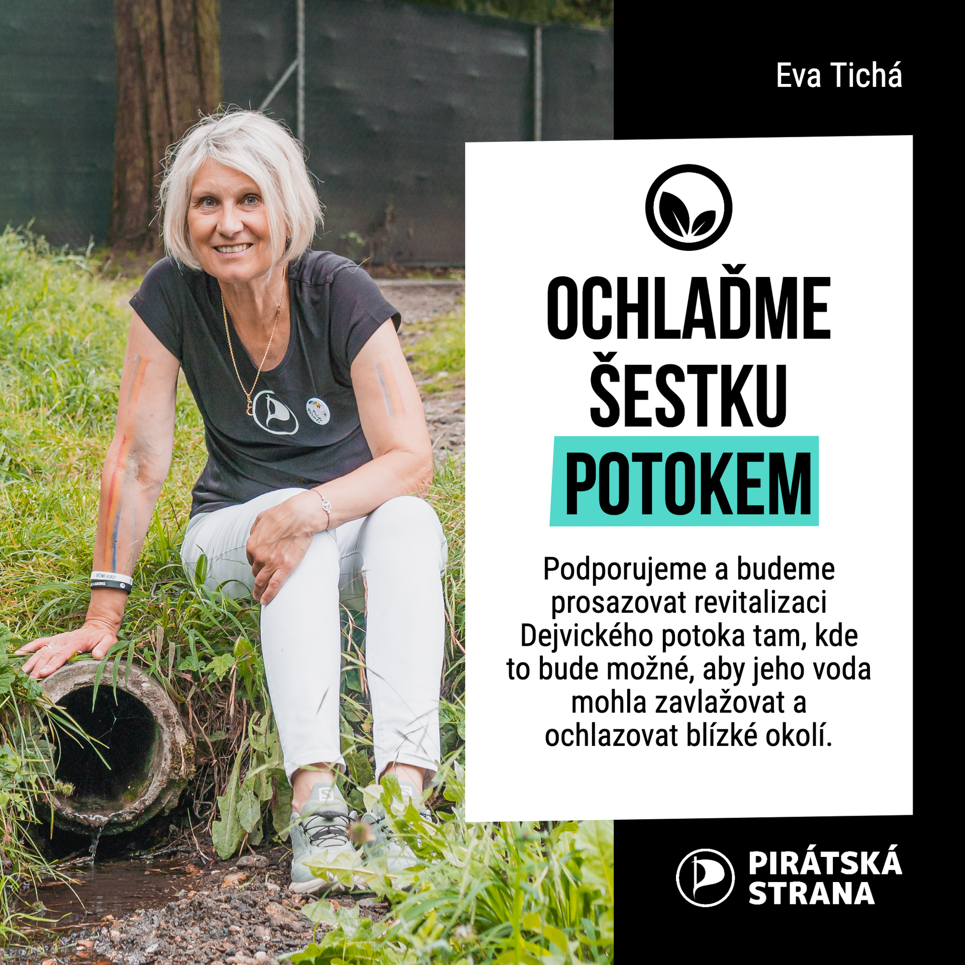Podporujeme a budeme prosazovat revitalizaci Dejvického potoka tam, kde to bude možné, aby jeho voda mohla zavlažovat a ochlazovat blízké okolí. Musí však mít regulovaný odtok, musí zde být naprojektovány retence, poldry, průsaky, zdrže apod. Nová trasa toku se nesmí stát nebezpečím pro stávající objekty, porosty a samozřejmě ani pro obyvatele.